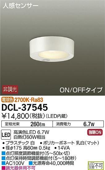 品番:DCL-37545品名:人感センサー付シーリング価格:14800円(LED内蔵)コメント:ライフ掲載頁:352メインスペック適合ランプ:高演色LED 6.7W 電球色 2700K素材/色/仕上:プラスチック 白ポリカーボネート 乳白(マット)寸法:径φ175 高60mm重 量:0.5kg機能/他:■点灯照度調節機能付(5〜50lx・切)■点灯保持時間調節機能付(5〜180秒)■AC100V■光源寿命40,000時間■調光器併用不可14VA定格光束 260lm消費電力 6.7WRa83白熱灯60W相当人感センサーON/OFFタイプ発刊年:2018年度版 メーカー希望小売価格はメーカーカタログに基づいて掲載しています