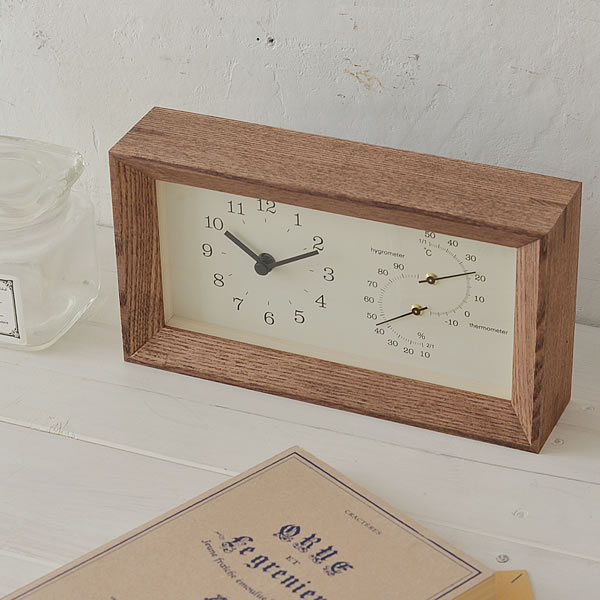 心地よいナチュラルテイストの温湿時計≪FRAME≫シンプルなデザインに四角い木目のフレームが温かみのある時計。