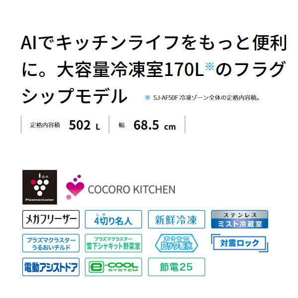■ SHARP ■◆ 主な特長 ◆◆ 主な仕様 ◆定格内容積502L各室容量冷蔵室:259Lアイスルーム:21L冷凍室上部:20L冷凍室下部:129L野菜室:73L外形寸法幅685mm×奥行699mm×高さ1,833mm必要設置スペース幅695mm×奥行704mm×高さ1,883mm質量109kg年間消費電力量(50/60Hz)250kWh/年(JIS C 9801-3 : 2015)