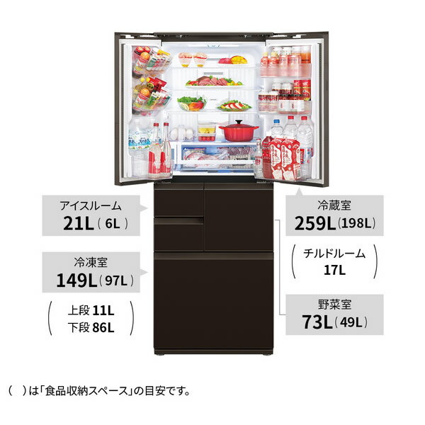 ■ SHARP ■◆ 主な特長 ◆◆ 主な仕様 ◆定格内容積502L各室容量冷蔵室:259Lアイスルーム:21L冷凍室上部:20L冷凍室下部:129L野菜室:73L外形寸法幅685mm×奥行699mm×高さ1,833mm必要設置スペース幅695mm×奥行704mm×高さ1,883mm質量109kg年間消費電力量(50/60Hz)250kWh/年(JIS C 9801-3 : 2015)
