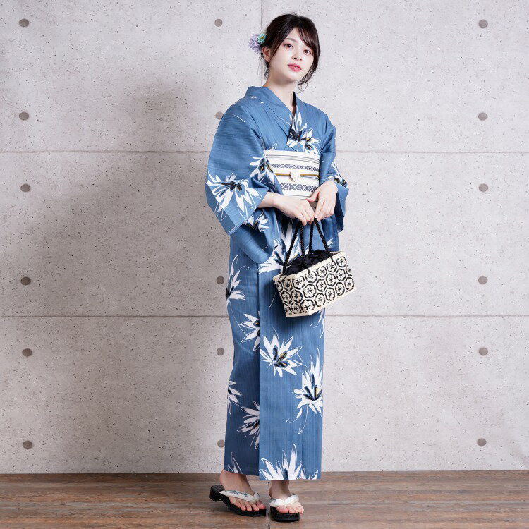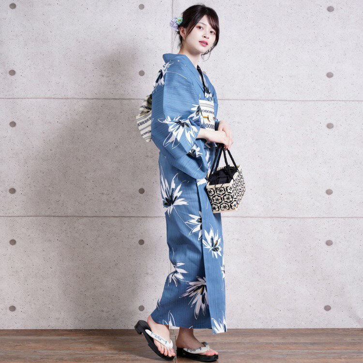 身丈 165cm 袖丈 約49cm 裄丈 約67cm 素材 ゆかた : 綿100% 帯 : ポリエステル 下駄 : 桐(商品画像はイメージです。